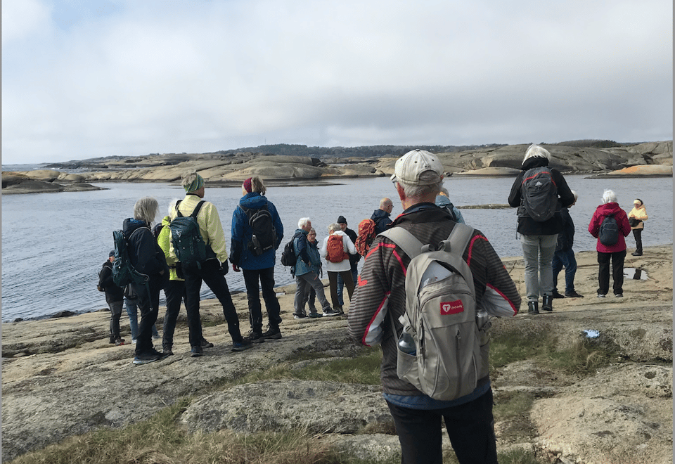 Etter en noe kjølig start kom solen fram og mens vi gikk over svabergene kunne vi nyte den flotte utsikten over sjøen med holmer og skjær. Fire fyrer og en flokk ærfugl hadde vi også innen synsvidde.