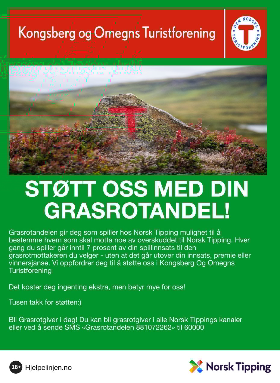 -Gå inn på https://www.norsk-tipping.no/grasrotandelen , trykk på "Velg mottaker", søk opp Kongsberg og Omegns Turistforening