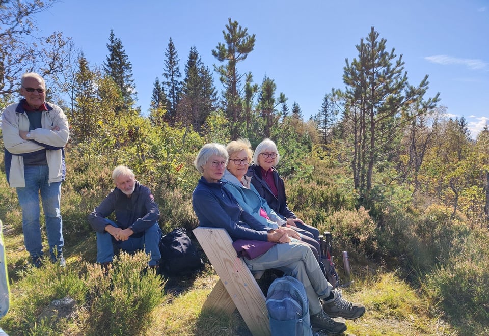 Vi var 11 deltakere som så la i vei langs fine, merkede turstier, mye lagt på eldre tømmerveier. Vakkert høstvær og til dels idyllisk edelløvskog og granskog la ei fin ramme rundt turen. Ei litt strevsom kleiv måtte forseres underveis, men her var det lagt ut tau til å dra seg opp langs. Toppunktet på Høgåsen er forsynt med en fin krakk og ei kasse med besøksbok å skrive seg inn i. Utsikten er upåklagelig. Lett nedstigning på nordsida av åsen, svakt dreiende gjennom en sopprik skog mot bilene ved Vesetrud. Knapt 3 timer tok turen.