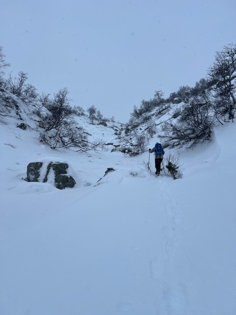 Veien opp til Vinddalen er bar, enkelte partier med litt is. Stien inn til Skåpet er isete og særdeles glatt. Brodder anbefalt. Bekken er frosset, så vann må tines.