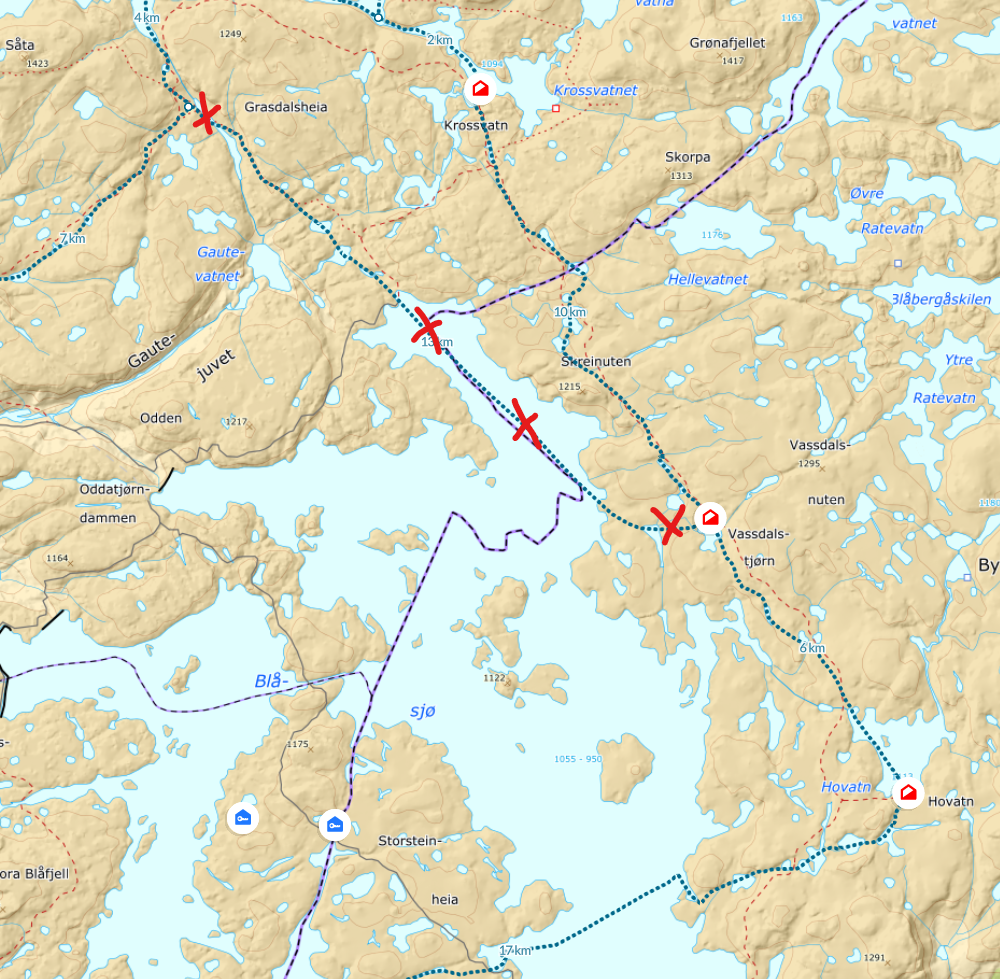 NB: Etter ekstrem nedbør torsdag 24 juli 2025 er det gått et ras på ruten mellom Viglesdalen og Trodla Tyssdal. Jord, stein og grus ble tatt med bekken som renner ned Tverrlihaugen. Denne ruten er svart merket /ekstra krevende.