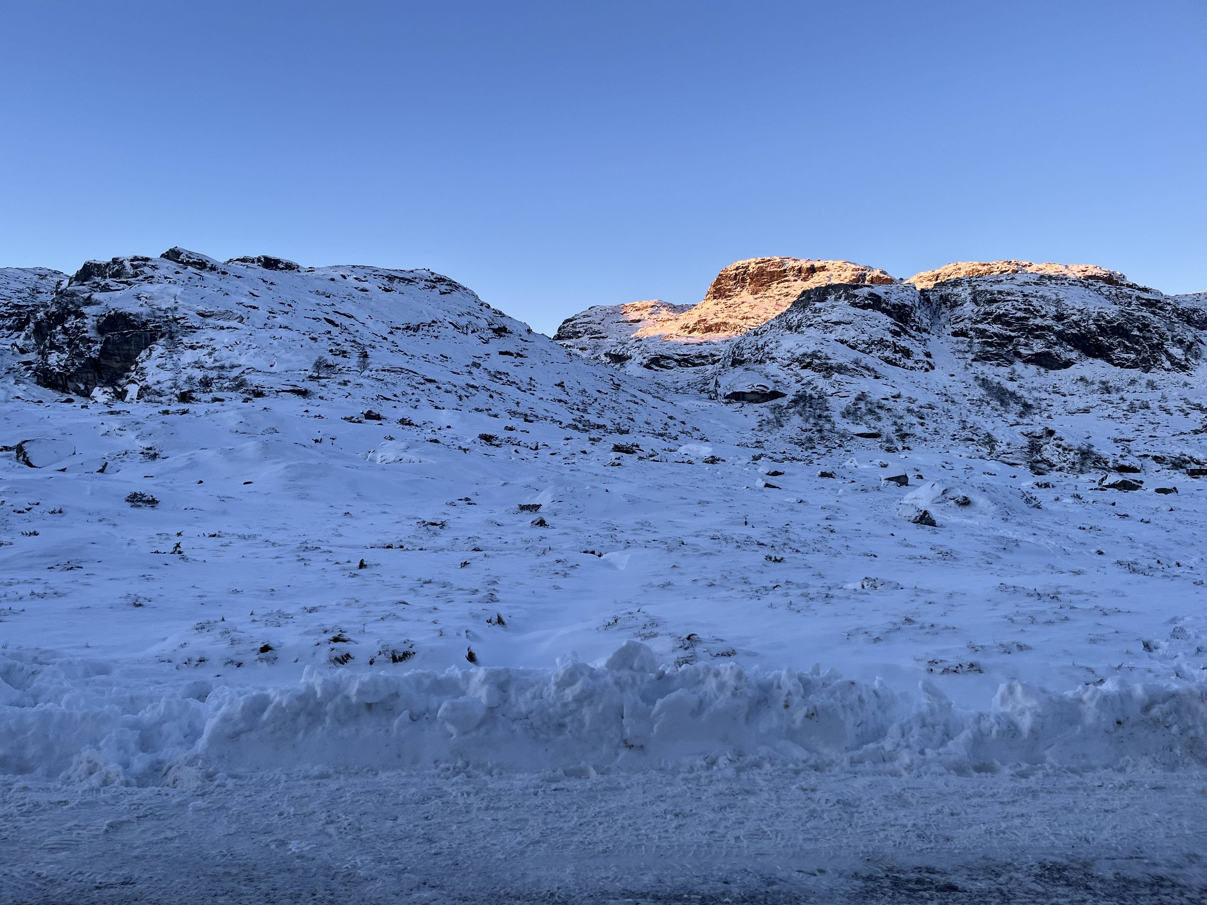 Snøfritt under 1000 moh.Brodder er viktig! Der hvor høghei møter låghei er det utfordrende føre, det er ikke "vinterføre" og ikke "barmarksføre", steinhard snø og is.