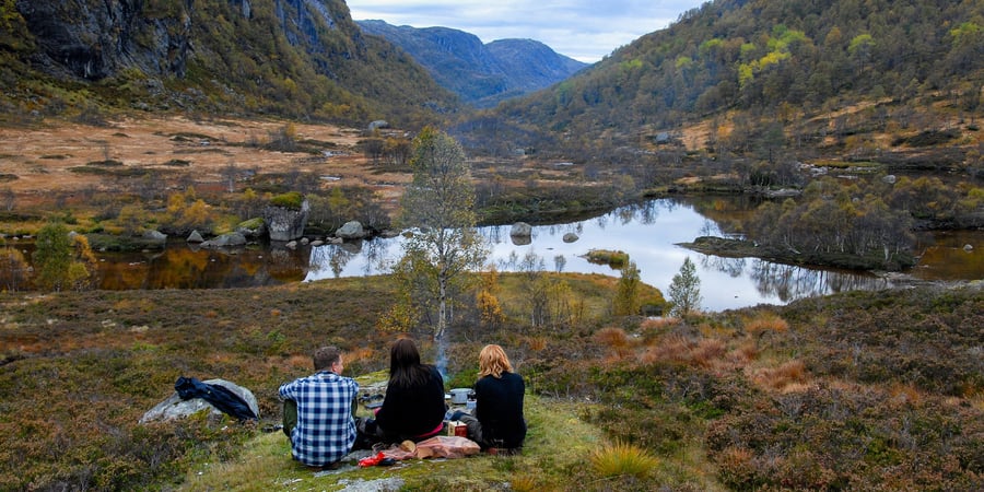 Trolsk furuskog, blankskurte berg, ulendte skrenter og små, idylliske tjern. Det er ikke rart tyskerne aldri oppdaget den lokale motstandsbevegelsens skjulested under krigen. Takket være innsatsen fra det lokale Heimevernet er hytta gjenoppbygget, og gir i dag et interessant innblikk i hvordan det må ha vært å gjemme seg for okkupasjonsmakten. Området har også et rikt plante- og dyreliv. Her er det perfekt å gå på oppdagelsesferd utenfor stien, men husk å holde tunga beint i munnen: her er det fort gjort å rote seg bort. Turen kan tas på flere måter, men det vanligste er å gå enten fra Preikestolen fjellstue eller fra parkering ved Riksveg 13 i Botsheia. Ta gjerne turen innom den etter hvert svært berømte Hatten på veien, og få panoramautsikt over Lysefjorden på kjøpet.