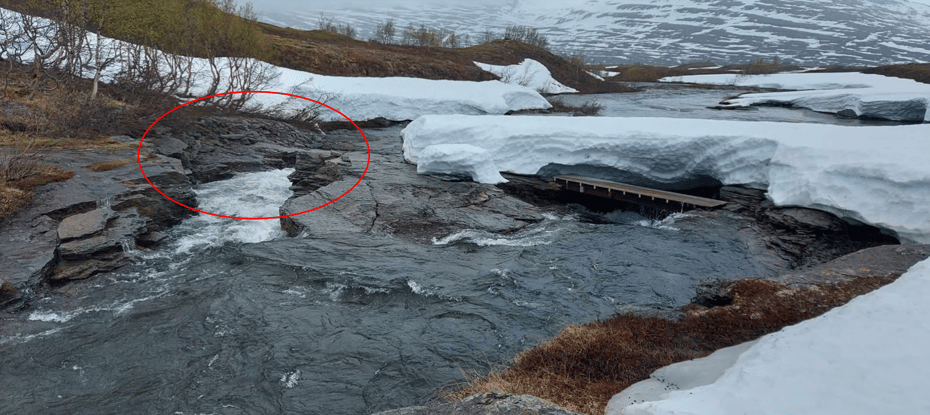 Brua tilhører Statskog, og Fjelltjenesten fikk lagt brua på plass igjen få dager senere. Takk til Fjelltjenesten for at ruta videre innover mot Gaskas og Vuoma nå er trygt farbar igjen!