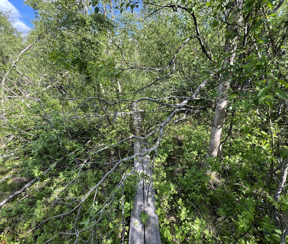 Ellers er det veldig mange dårlige klopper på øvre sti. Disse er lagt ut på initiativ fra nasjonalparkstyret for rundt 25 år siden. Det er Statskog Fjelltjenesten som utfører i felt i nasjonalparken, men de jobber da på oppdrag fra ØDN-styret. Vi har gjort henvendelser gjennom flere år for å få ØDN til å gjøre noe med de dårlige kloppene her, men uten respons. Nå råtner mange klopper bort fra ytterkantene, slik at de blir farlig smale å balansere på. Og stadig flere har knekt, slik at de ligger nede i myra. Det burde i tillegg ha vært kloppet flere steder, da det finnes flere gjørmepartier i dette området. Rester av gamle og dårlige klopper som er byttet ut, ligger lagra i stabler langs stien. Vi har også meldt inn at dette må fjernes, men ikke fått noen reaksjon så langt. Vi håper ØDN kan prioritere dette arbeidet det kommende året.