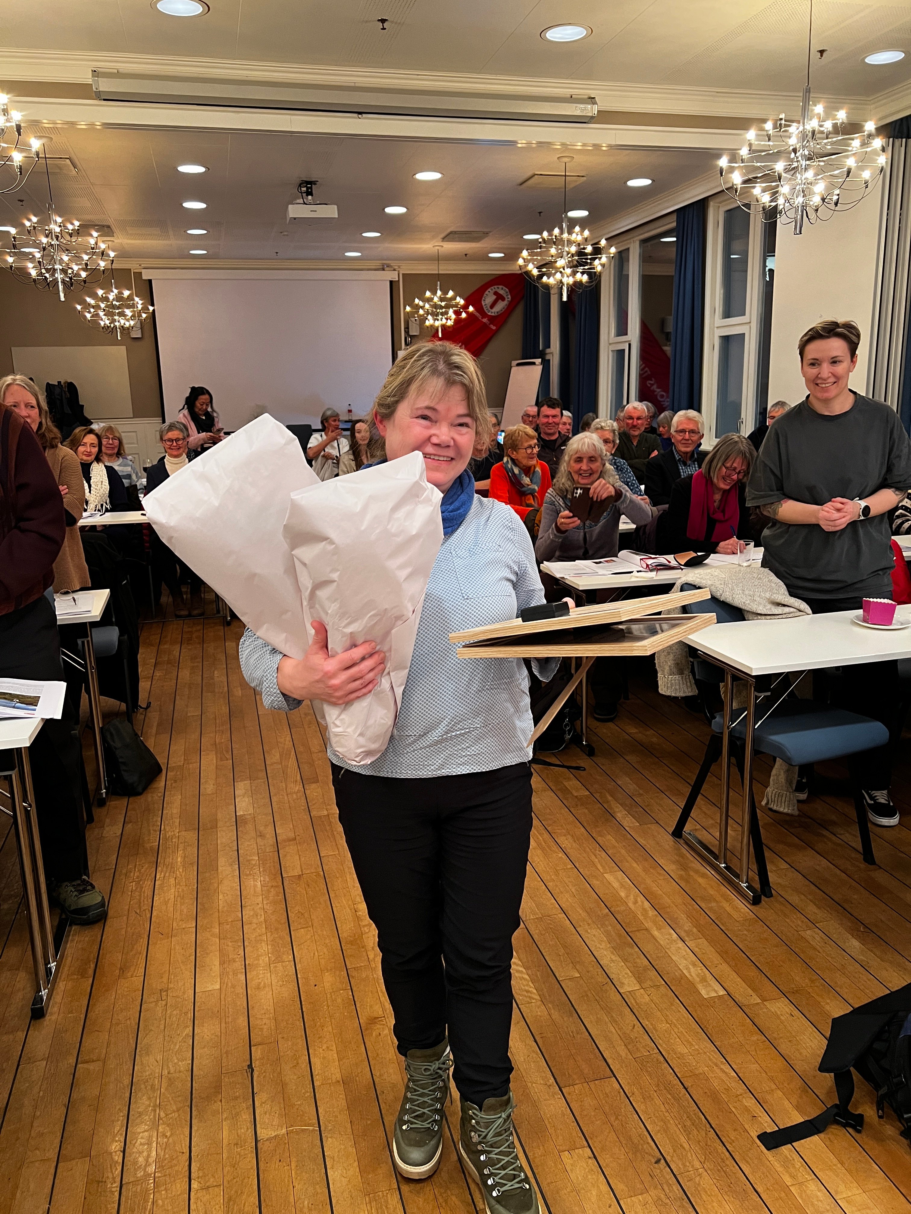 Svanhild fikk stående applaus da hun tok imot hederstegn, diplom og blomster. Odd var ikke til stede, for han var på dugnad på Gaskashytta, der disse to er tilsyn. Ikke helt uventa... :-)