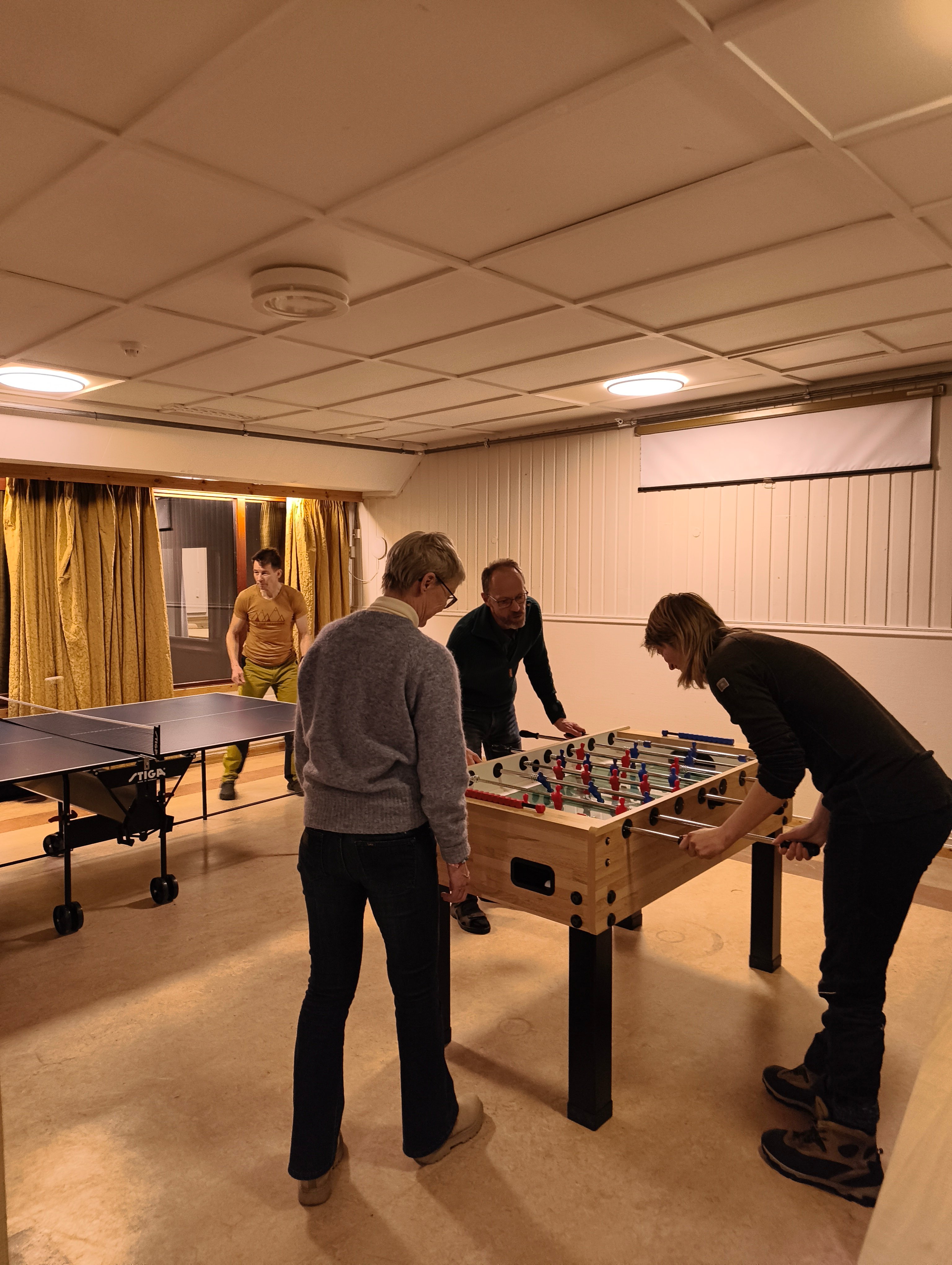 Kvelden ble avsluttet i peisestua, med noe godt i glasset, god prat eller, for de sprekeste, høylytt turnering i bordtennis og bordfotballspill til langt på kveld.