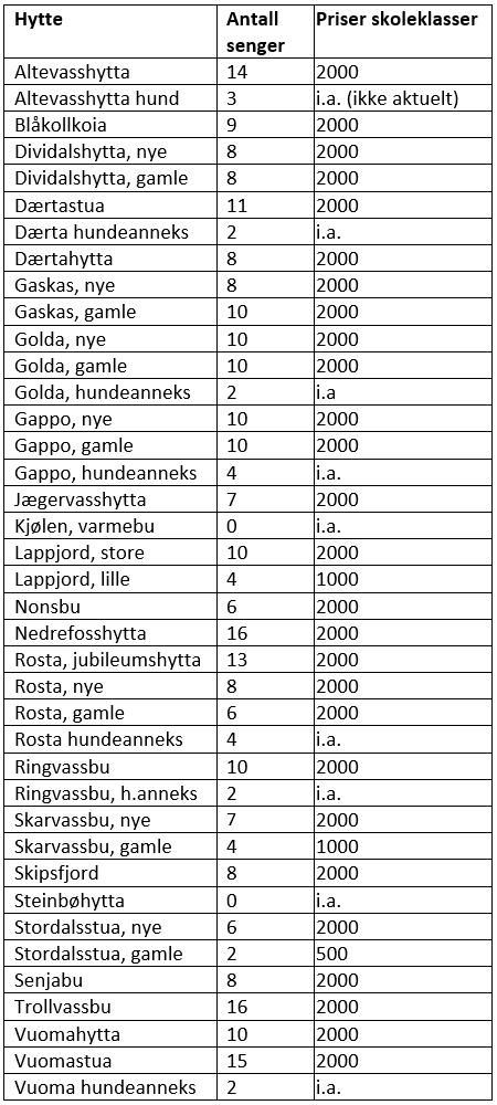 Skoleklasser skal betale kroner 2000 per døgn per hytte ved overnatting. Ved bruk av kun et par sengeplasser i hytte nummer to (halvparten eller mindre enn halvparten av sengene) er prisen kroner 1000 per døgn ved overnatting. Husk at en hytte må fylles opp før neste hytte benyttes! Dette av hensyn til andre turgåere.