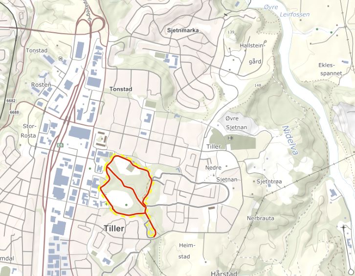 Midt innimellom boligområdene på Tiller er det ei lysløype. På sørsiden av Rostenhallen er det en veiundergang som leder deg rett inn til skisporene i rundløypa i Tillermarka med mulighet for å gå videre sørover mot Bjørnmyra.