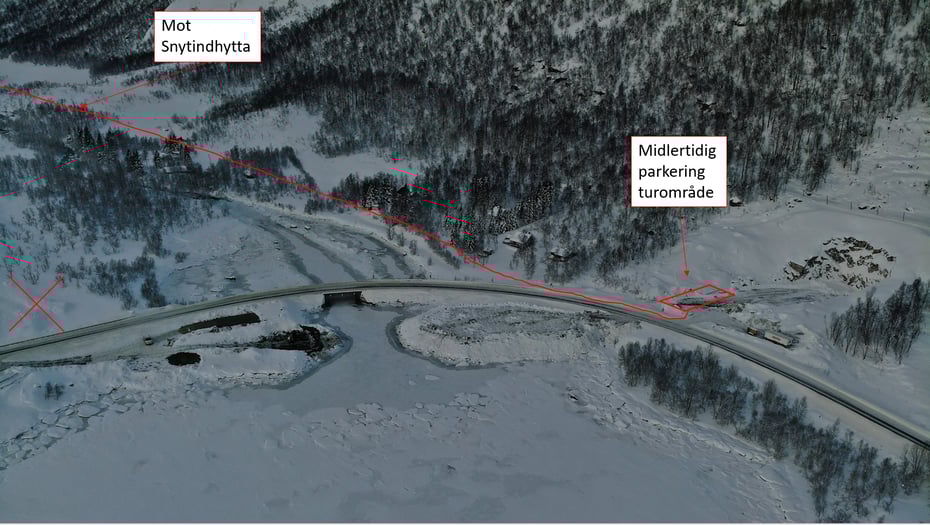 Entreprenøren Hæhre tilrettelegger en midlertidig parkering for turgåere på nordsiden av elva som benyttes inntil videre, se kartet. Både de som skal på Nonstinden, innover Løbergsdalen på isfiske eller til Snytindhytta kan parkere her. En kan da gå enkelt og greit gjennom hyttefeltet opp til Løbergsvatnet.