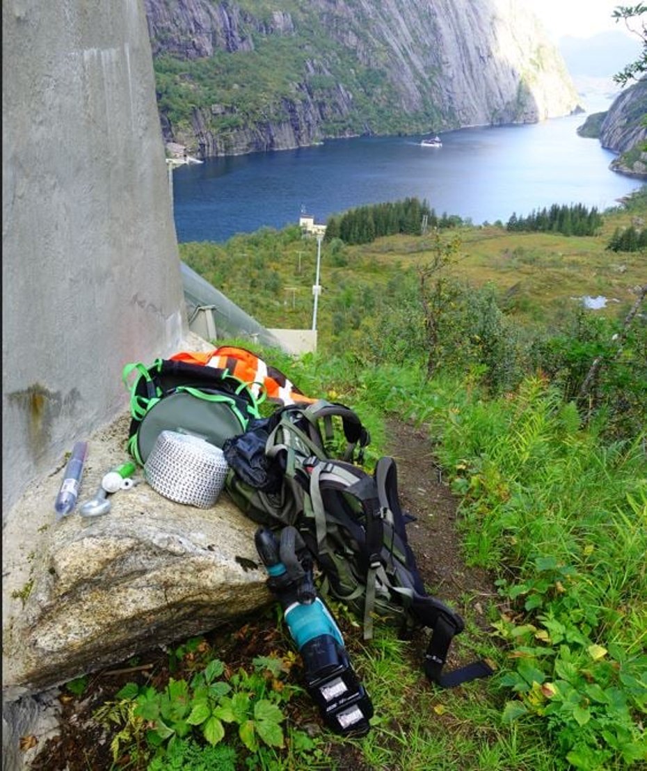 På bildet ser vi fjellboremaskin, tau og bolter som ble båret opp og montert torsdag 5. september.