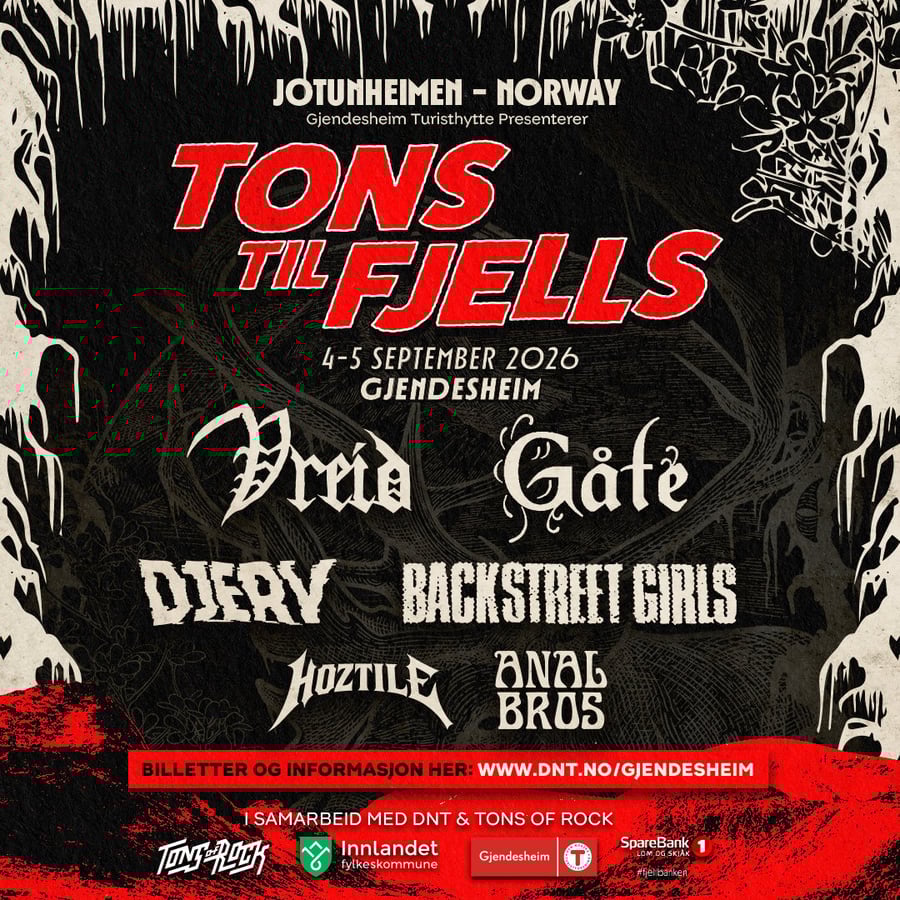 En fantastisk festivalopplevelse i spektakulær norsk natur ved Gjendesheim. Dette er en unik nyskapning, satt i gang av Tons of Rock og DNT Gjendesheim Turisthytte, med ikoniske Gjende, Besseggen og Jotunheimen som bakteppe. En heftig høsthelg fylt med inspirerende måltider, aktiviteter, natur og kulturhistorie. Programmet toppes av konserter med tunge publikumsfavoritter. Her kombineres musikk, fjelluft og fellesskap på en måte du ikke opplever noe annet sted. Under finner du alt du trenger for å planlegge turen – fra billetter og overnatting til transport, program og praktisk informasjon. Dette møter deg: 🔥 Vreid 🔥 Gåte 🔥 Djerv 🔥 Backstreet Girls 🔥 Hoztile 🔥 Anal Bros 🔥