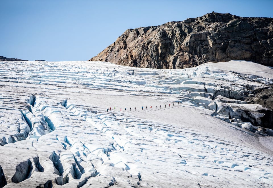 The journey begins with a 15-17 km trek through varied high mountain terrain, mostly off the marked DNT trails. The hike includes several stops where you can learn about the area and the glacier's history. At the foot of the glacier, all participants are equipped before heading onto the spectacular glacier in a rope team – we promise an experience you will never forget.