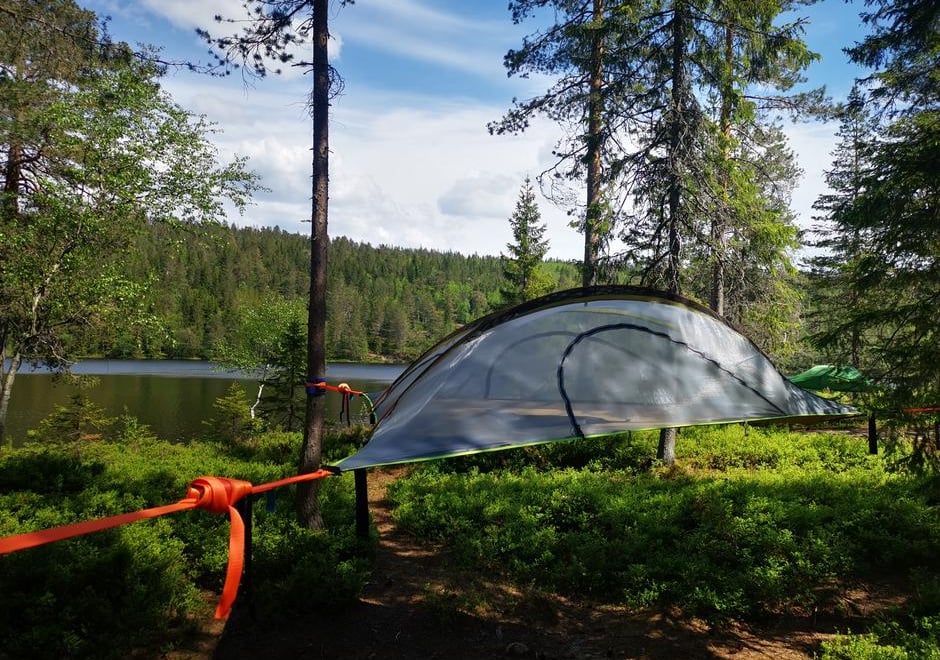 I sommerhalvåret kan du leie svevetelt hos oss. Svevetelt, eller tretelt om du vil, er rett og slett et telt som blir stroppet opp mellom tre trær. Det blir litt som en blanding av hengekøye og telt. Du får fordelene med et telt, ved at du ligger relativt flatt. Samt fordelene fra hengekøye, ved at du ligger over bakken og svever mellom trærne.