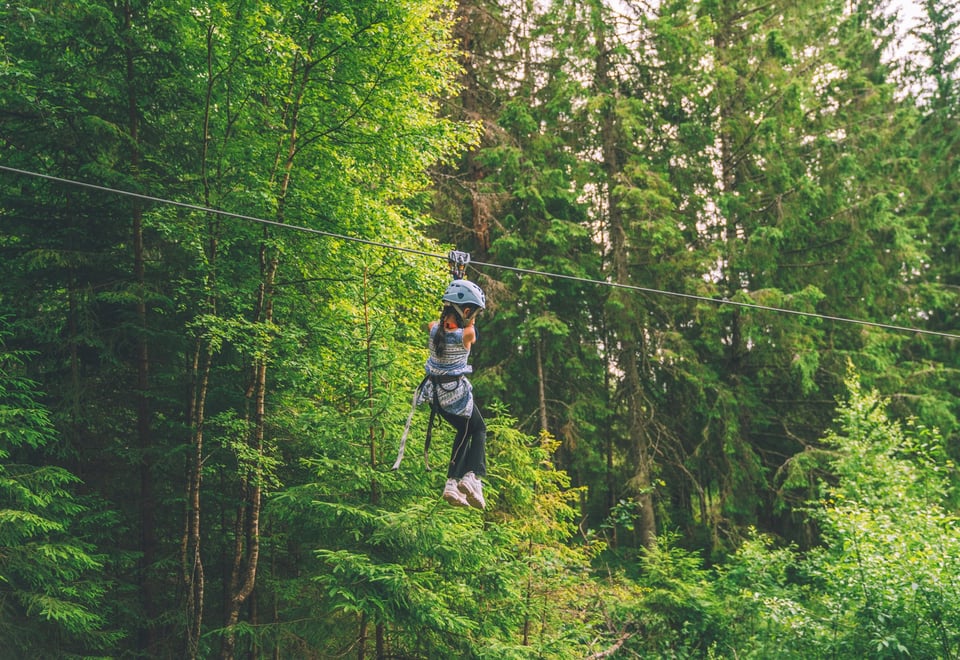 Å kjøre zipline er en artig aktivitet for hele familien. Ziplinen på Sæteren Gård er i år utvidet, og består nå av fire strekk mellom trærne. Du finner den innerst på området, forbi hinderløypa. Se opp for flyvende mennesker!