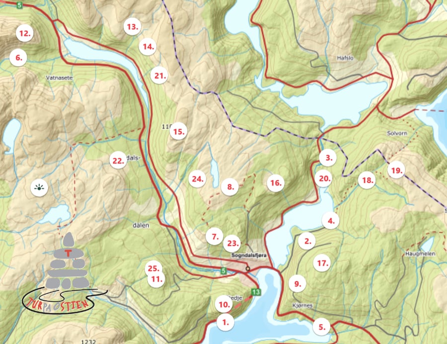 Sogndal Turlag har 25 postar som ligg nær Sogndal sentrum og i Sogndalsdalen. Til alle turpostane går det skilta og merkte stiar. Du finn skildring av turane på DNT sin turapp UT.no.