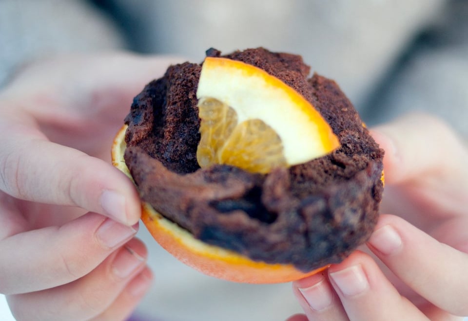 Skjær av toppen av appelsinen, omtrent som du kapper et egg. Bruk kniven til å skjære ut innholdet i appelsinen. Dette blir en sunn liten forrett. La det være litt kjøtt igjen for å unngå at det blir appelsinskrellsmak på kaken! Fyll sjokoladekakerøre i appelsinen slik at den er omtrent halvfull. Legg på «lokket» igjen, og pakk den inn i folie slik at lokket holder seg på plass. La den stå i glørne på bålet i ca. 20 min.