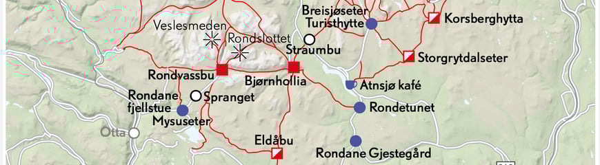 Se kart over stier og hytter i Rondane